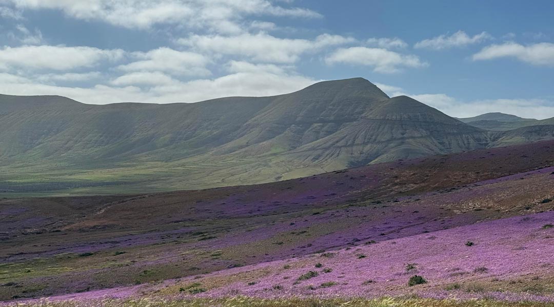 Die Insel zeigt sich noch immer von ihrer saftigsten Seite, übersät mit unzähligen kleinen lila Blümchen, welche die Hügel rund um La Oliva schmücken.